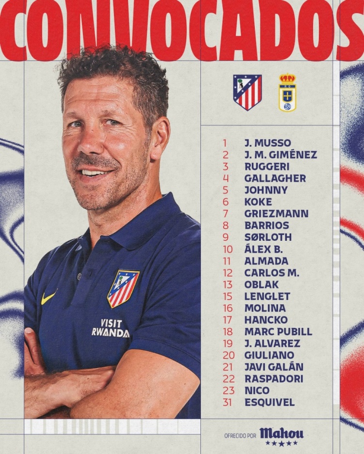 时尚:7-格列兹曼、9-瑟尔洛特、11-阿尔马达、19-阿尔瓦雷斯、20-朱利亚诺-西蒙尼、22-拉斯帕多里、23-冈萨雷斯