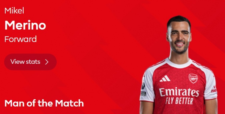 本场比赛梅里诺传射立功,赛后当选英超官方球迷票选全场最好球员。
