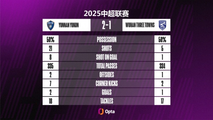 云南玉昆本场比赛21次射门、8次射正,皆刷新球队单场中超新高