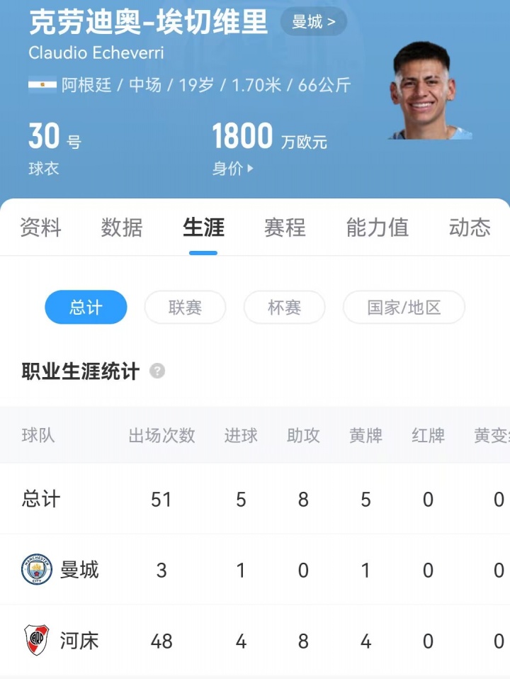 19岁的埃切维里冬窗致密加入曼城威望,现在仅为曼城出场过3次,孝顺1粒进球,现身价1800万欧。