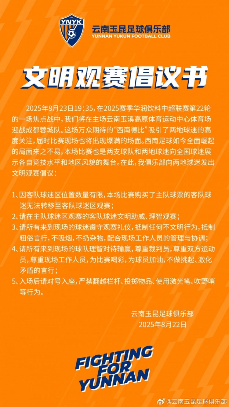 2025年8月23日19:35,在2025赛季中超联赛第22轮的一场焦点战中,咱们将在主场云南玉溪高原体育融会中心融会场迎战成齐蓉城队。