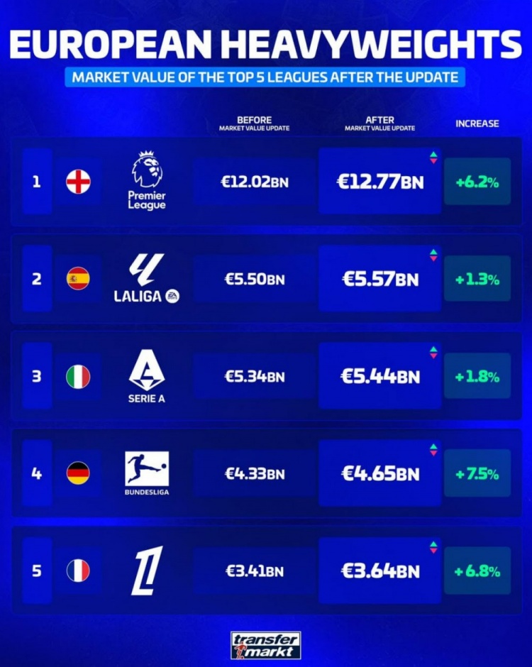 10月20日讯 德转此前更新了足坛球员身价,并清点了五大联赛球队总身价榜,其中英超遥遥跨越,以下为具体情况:
