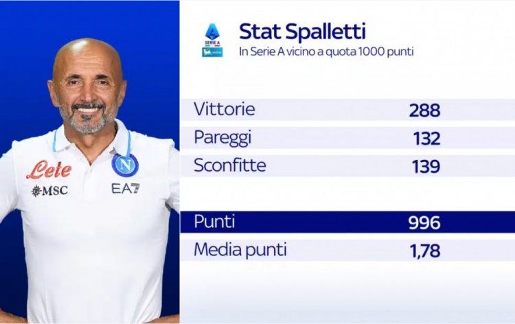 数据统计知道,斯帕莱蒂系数介怀甲得到288胜、132平、139负,总积分996分、场均积分1.78分。