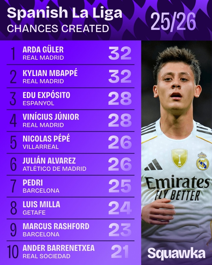 11月12日讯 Squawka统计本赛季西甲创造契机次数,居莱尔、姆巴佩32次最多。