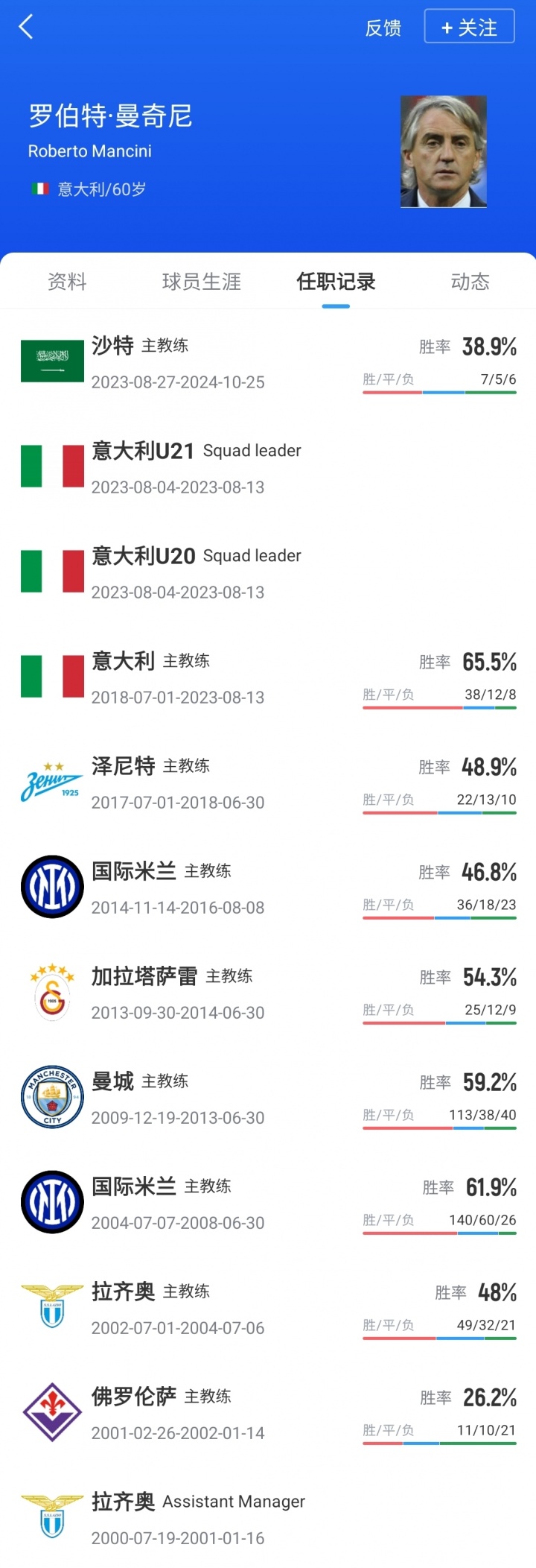 2023年8月,曼奇尼因与意大利足协矛盾短暂文告下野,随后他摄取了沙特国度队的邀约,签约至2027年,年薪2500万欧。