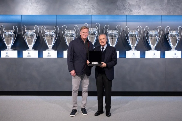 皇马主席弗洛伦蒂诺会见NFL总裁,两边互赠礼物