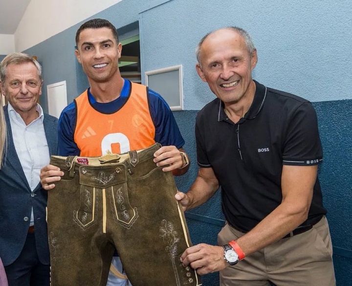 赛前,奥地利当地旅游部门细密东说念主向C罗缓助了一条具有当地特点的手工皮裤,上头刻有克里斯蒂亚诺-罗纳尔多的名字,以此来抒发对这位足坛传说巨星的敬意与宽待。