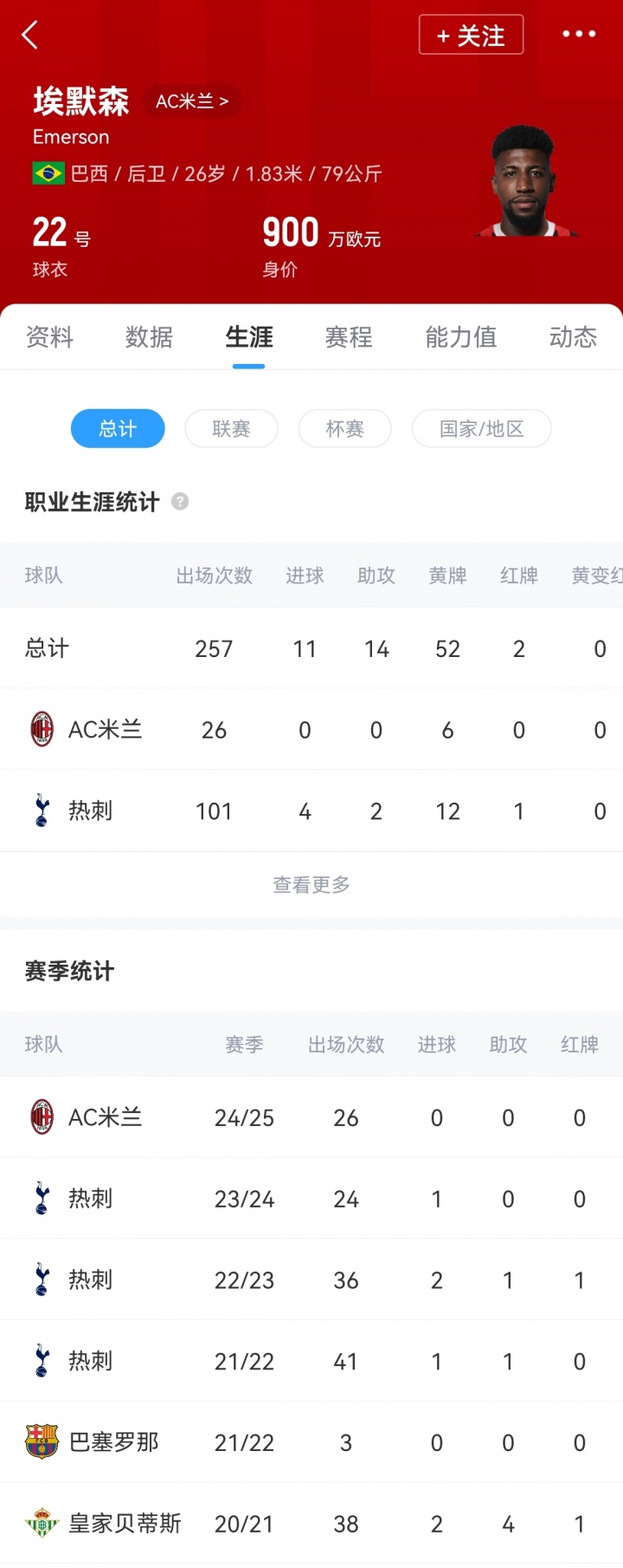 埃默森昨年夏窗1500万欧元从热刺加盟米兰,上赛季代表AC米兰出场26次。