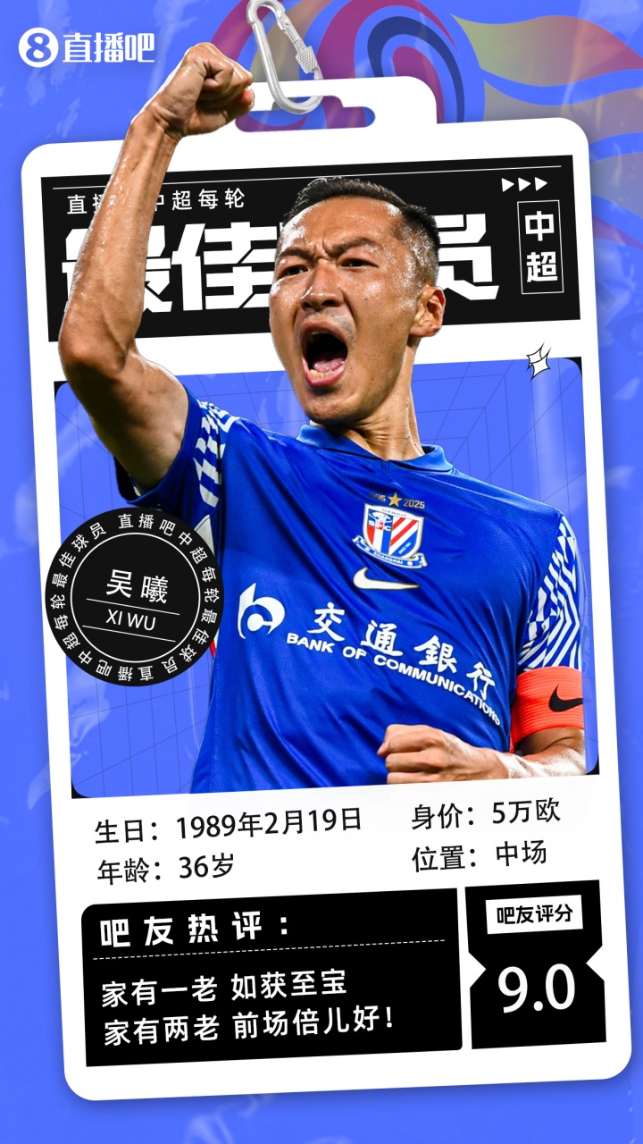 【】中超第26轮最好球员评比效力出炉,上海申花队长吴曦当选!36岁的吴曦梅开二度,带领申花主场6-1打败梅州客家,保握对中超冠军的冲击,这是吴曦本赛季第二次获取中超最好评比!