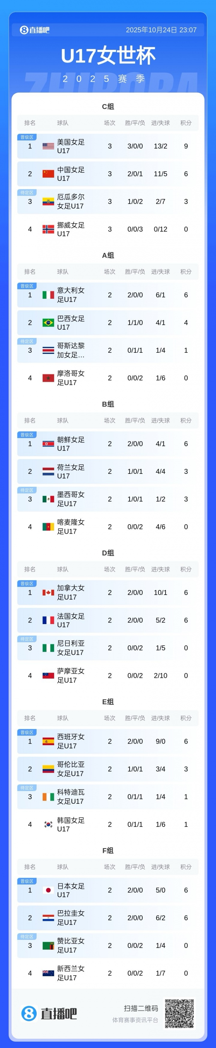 10月24日讯 U17女子寰宇杯,中国女足U17以4-0完胜厄瓜多尔,以小组第二的收获晋级赛事16强,最终本组积分榜如图。