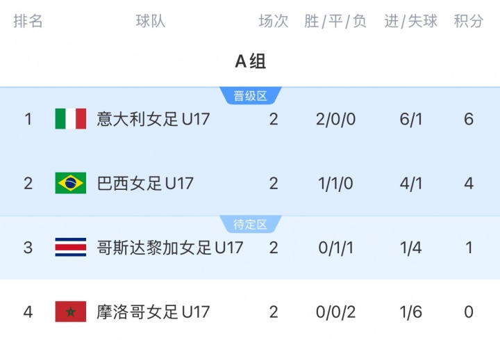 U17女子寰宇杯C组最终积分榜:中国队2胜1负6分小组第二晋级16强