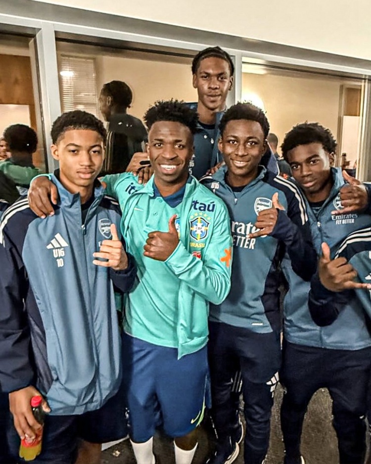 维尼修斯随巴西队在阿森纳基地纯属,备战这场友谊赛,他与阿森纳的青训球员合影。
