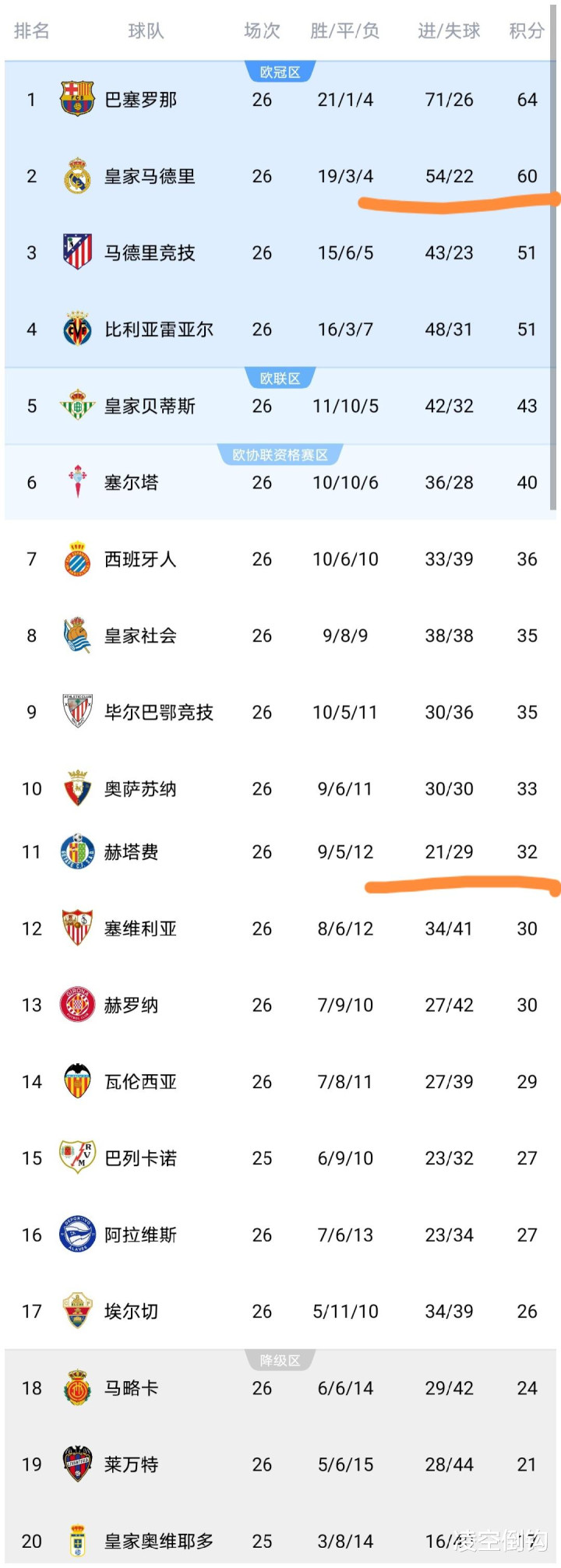 可以看到在皇马爆大冷门输给了赫塔费队之后,积分停留在了60分,都是踢了26轮的情况下,正式落后领头羊巴塞罗那队4分。这只能怪皇马自己不争气了。姆巴佩伤缺的情况下,皇马的进攻火力明显下降,皇马要加油啊,该拿的分都拿不下来,还怎么跟巴萨争冠。而赫塔费队在击败皇马拿到3分之后,积分已经上涨到了32分,排名飙升到了第11位,距离第10的奥萨苏纳队1分,同时距离第7的西班牙人队仅4分,此外赫塔费领先降级区8分之多,保级压力瞬间小了很多。