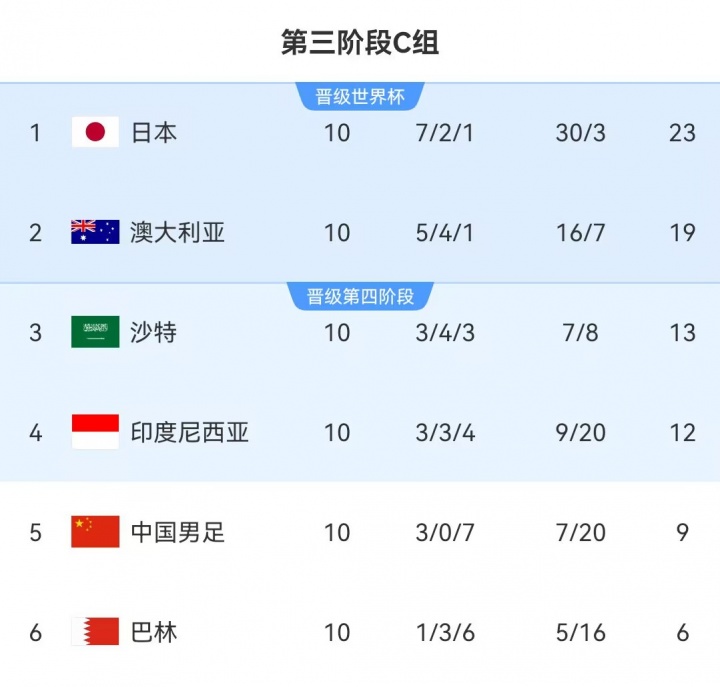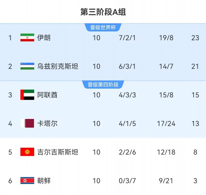 世初赛第3阶段,国足与阿联酋永别被分至C组、A组;本阶段最终国足积9分名次小组第5无缘晋级下一阶段,阿联酋积15分名次小组第3晋级。