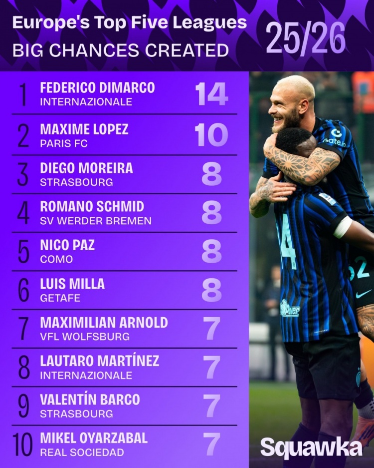 本赛季五大联赛创造紧要契机榜:迪马尔科14次居首,帕斯8依次三