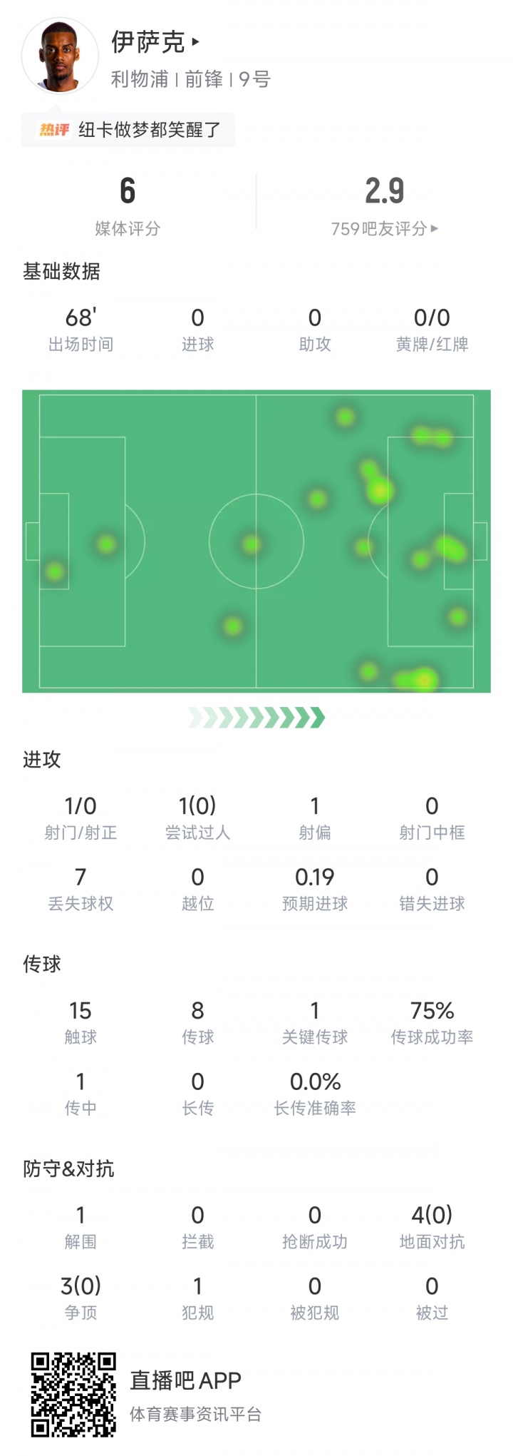 利物浦从纽卡淘来的先锋伊萨克发扬欠佳,本场的数据更是说来话长。赛季初的罢训事件和他此前的伤病依旧影响着这名瑞典神锋。