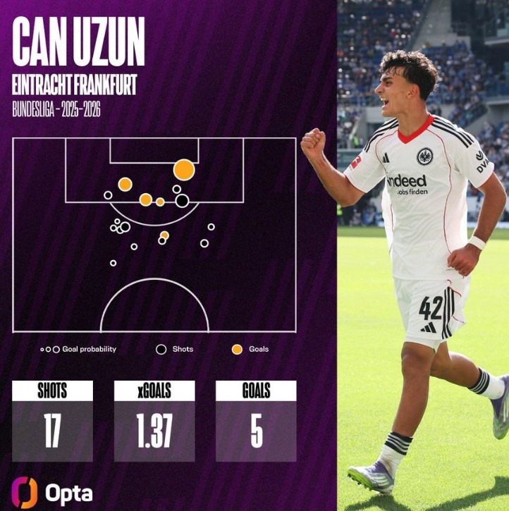 乌尊都集5场德甲破门,是本世纪五大联赛第4位作念到的U19球员