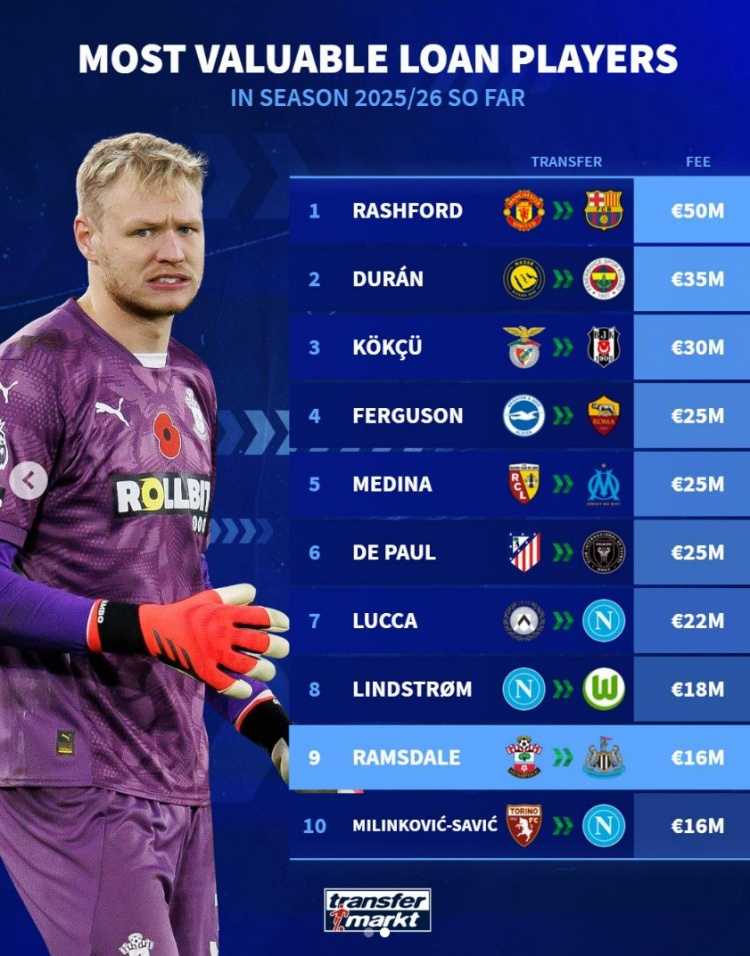 本年夏窗租赁球员身价榜:拉什福德居首,德保罗、拉姆斯代尔在列