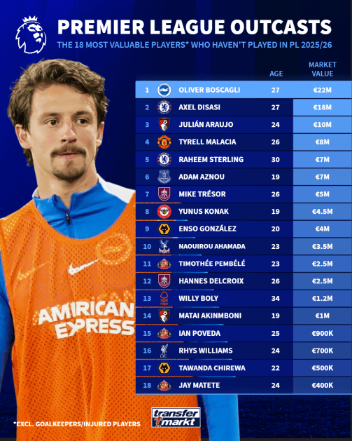 本赛季英超未出场球员身价榜: 迪萨西1800万第2, 斯特林第5
