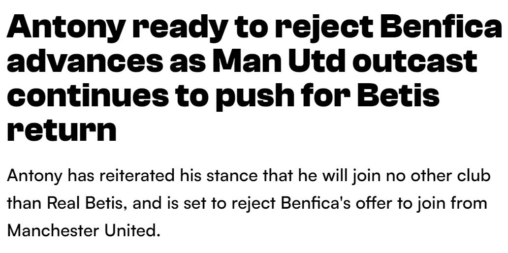 曼联的1亿欧元先生安东尼并不贫苦下家,最近葡超权门本菲卡也向他抒发了酷爱。然则,25岁的巴西边锋只念念重返皇家贝蒂斯,再次辨认其他转会出息,对此红魔十分无可若何。