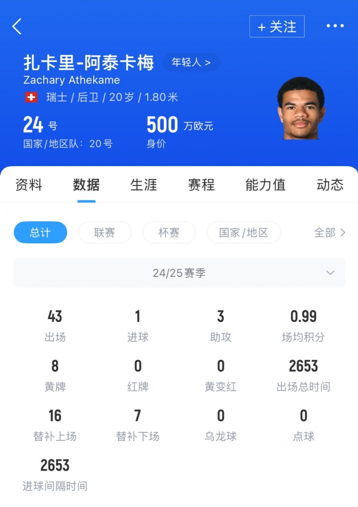 阿泰卡梅现年20岁,瑞士籍右后卫,习用右脚,也可胜任右翼卫。上赛季他代表年青东谈主各项赛事出战43场,孝敬1球3助攻。现在他的身价为500万欧。