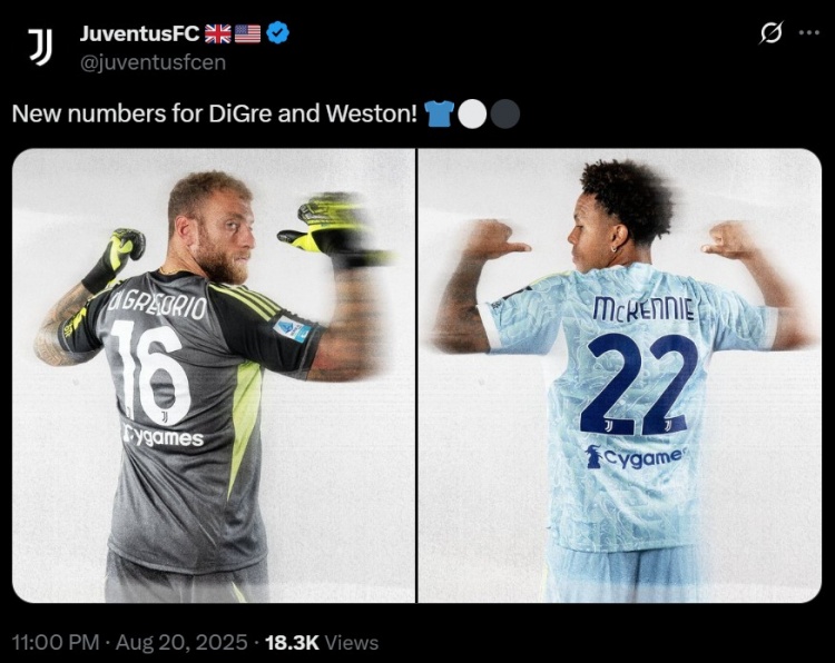 尤文臣宣,迪格雷戈里奥以及麦肯尼更换号码。