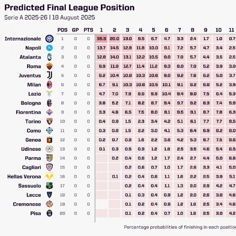 opta通过超等计较机揣测本赛季意甲排行,国米有35.9%的概率夺冠