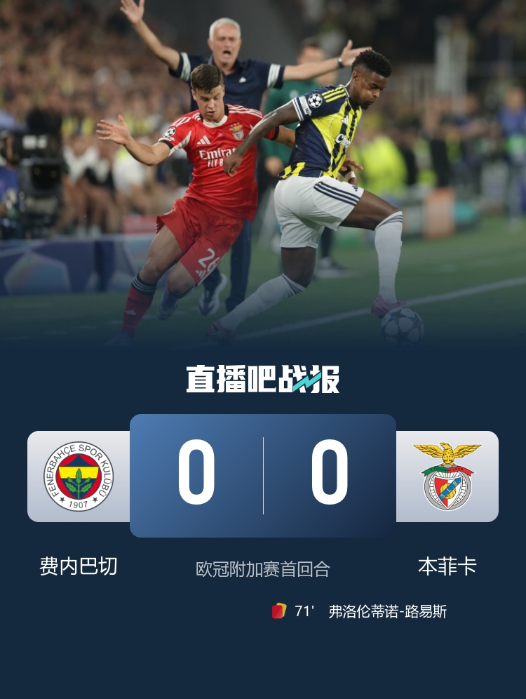 费内巴切0-0本菲卡,两边次回合将在28日凌晨移师本菲卡主场。