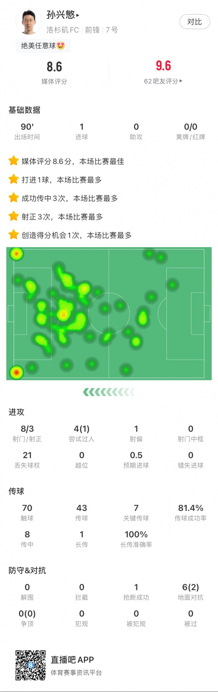 8月24日讯 好意思职联洛杉矶FC1-1达拉斯FC,本场比赛洛杉矶FC球员孙兴慜自便球破门收成处子球。以下为他在本场数据: