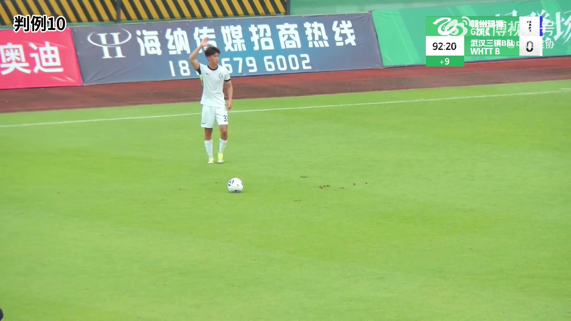 关于此判例,评议组一致觉得:武汉三镇B队守门员最初触球,赣州瑞狮59号队员的争抢作为未顾及可能对对方队员变成的危机,应视为讲理犯规,并出示黄牌,后续进球无效。评判员判进球灵验的决定失误,漏判赣州瑞狮59号犯规和黄牌。(视频:判例9)
