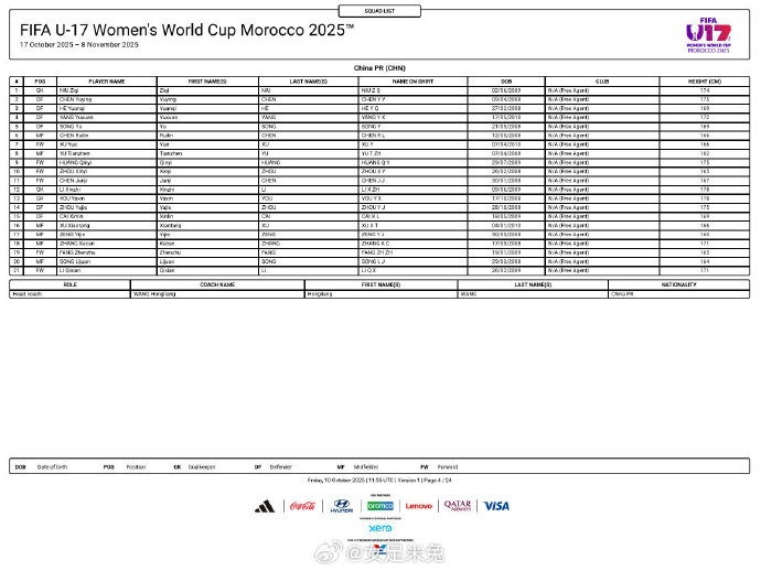 10月11日讯 中国U17女足的U17女足寰球杯报名名单公布,共21名球员入选。
