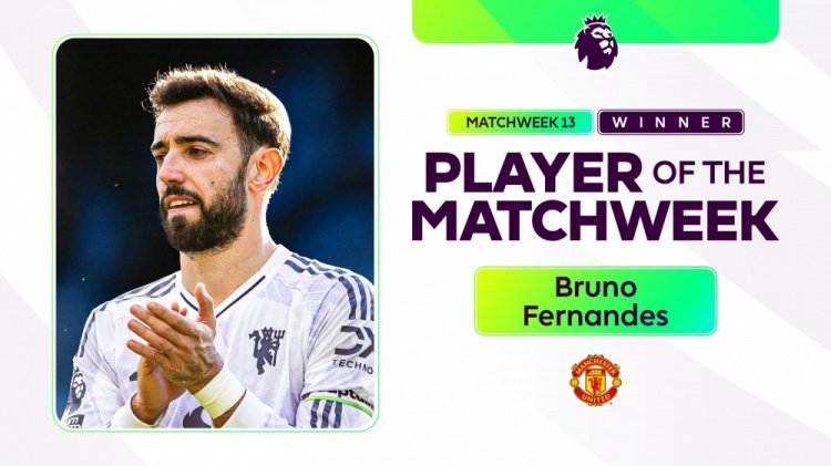 官方:B费当选英超第13轮最好球员,对阵水晶宫送出2次助攻