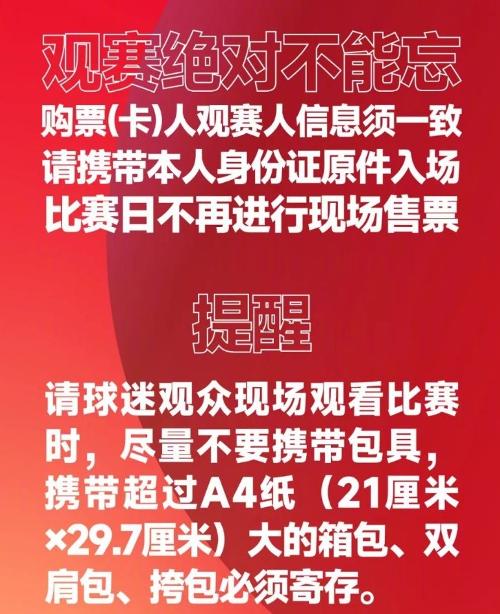 为了减少您的入场列队时刻,请入场球迷务必佩戴本东谈主身份证原件入场(其他证件无效),以便快速通过安检不雅看比赛。