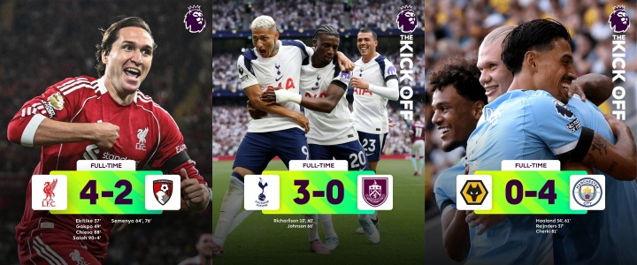 08月18日讯 新赛季英超首轮基本截至,传统BIG6的比赛皆还是打完,其中利物浦4-2伯恩茅斯、曼城4-0狼队、热刺3-0伯恩利、切尔西0-0水晶宫、阿森纳1-0曼联。