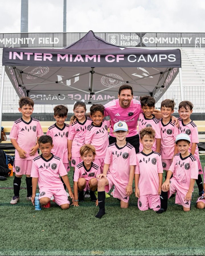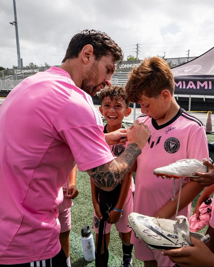梅西出席迈阿密国外青训学院的活动,与小球员互动,为他们签名并合影。