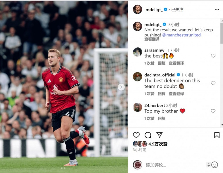 德里赫特此役为曼联踢满全场,赛后他在酬酢媒体上写说念:“这不是咱们思要的后果,让咱们不时勉力!”