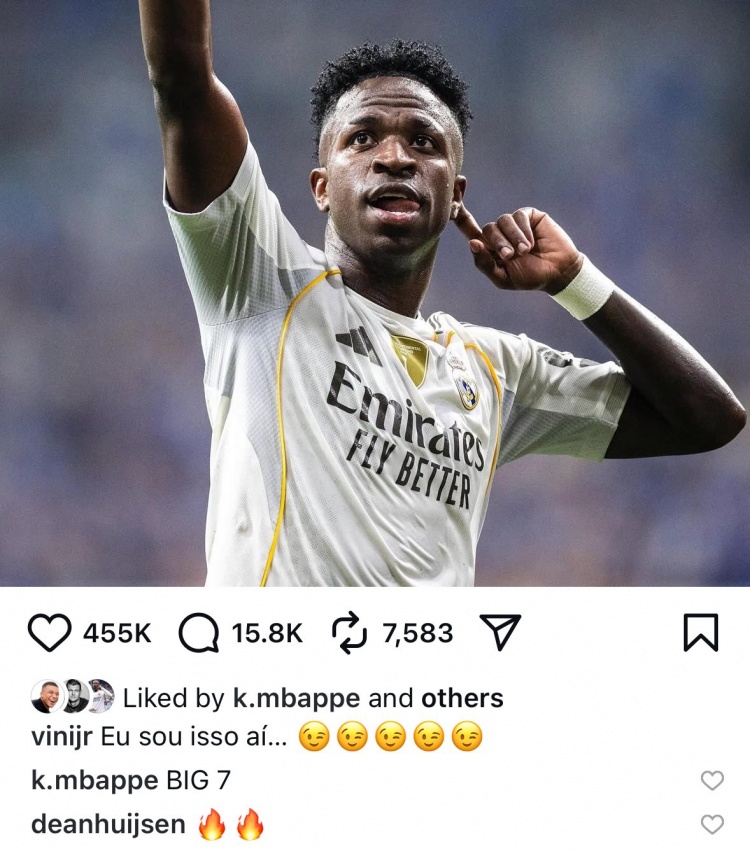 维尼修斯社媒晒照庆祝收效,姆巴佩点赞评述:BIG 7