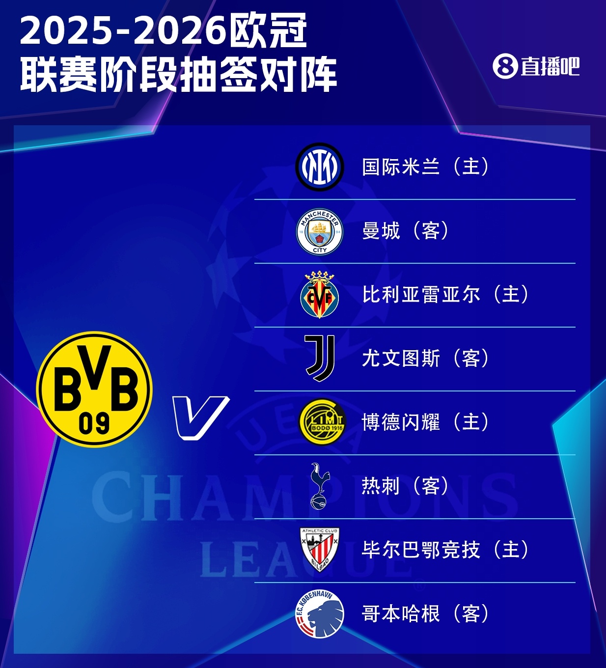 8月29日讯 2025/26赛季欧冠抽签效果出炉,联赛阶段多特将和曼城、国米、尤文、热刺、黄潜等交手。