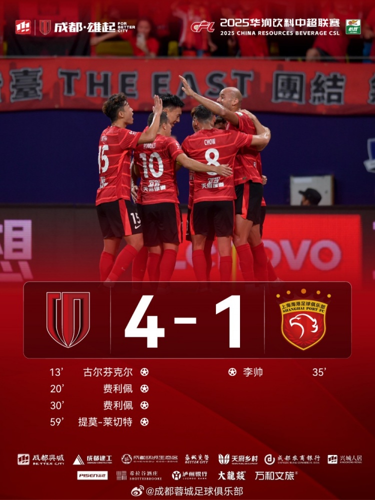 大胜!费利佩双响、韦世豪献助攻,成皆蓉城4-1驯服上海海港