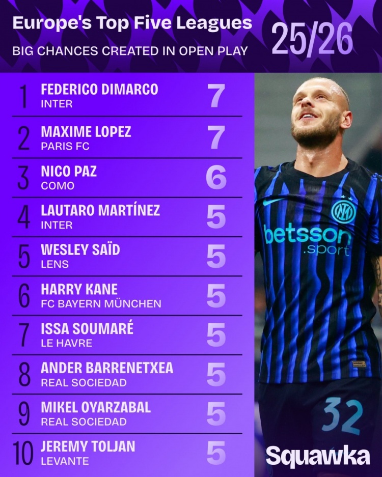 10月9日讯 Squawka统计了球员本赛季在五大联赛通顺战中创造缺点契机的次数,比肩出榜单,迪马尔科、洛佩斯7次居首,尼科-帕斯6法度三。