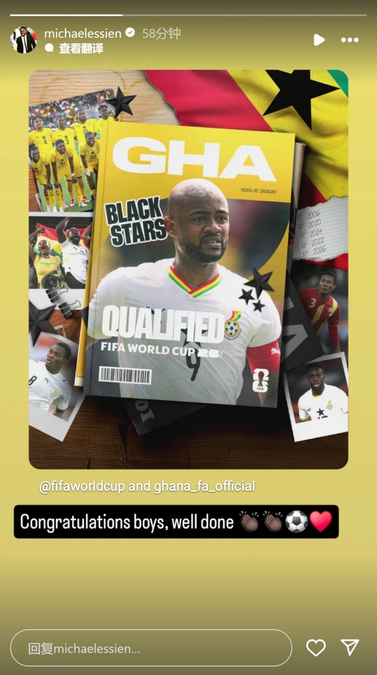 加纳足坛名宿埃辛社媒转发海报,道贺加纳进击天下杯,配文:“恭喜小伙子们,干得好!”