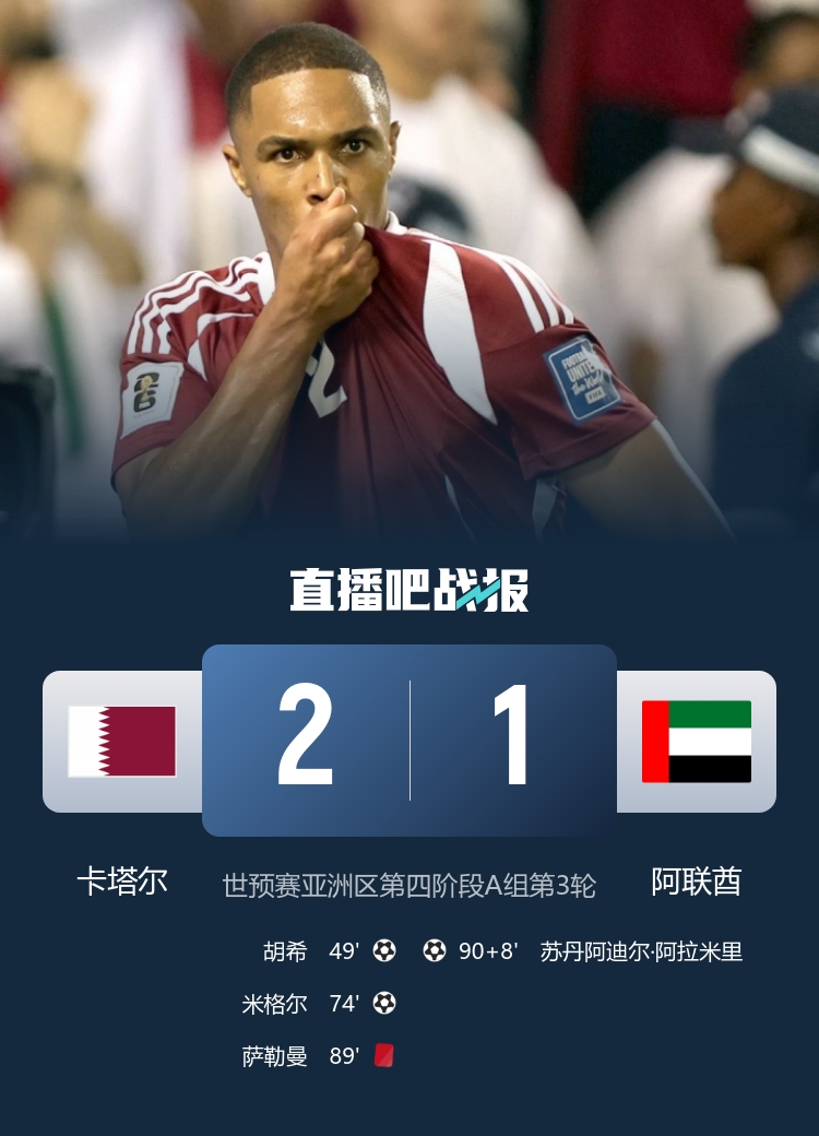 世初赛亚洲区第四阶段A组第3轮,10东谈主卡塔尔2-1慑服阿联酋,晋级2026年全国杯正赛。