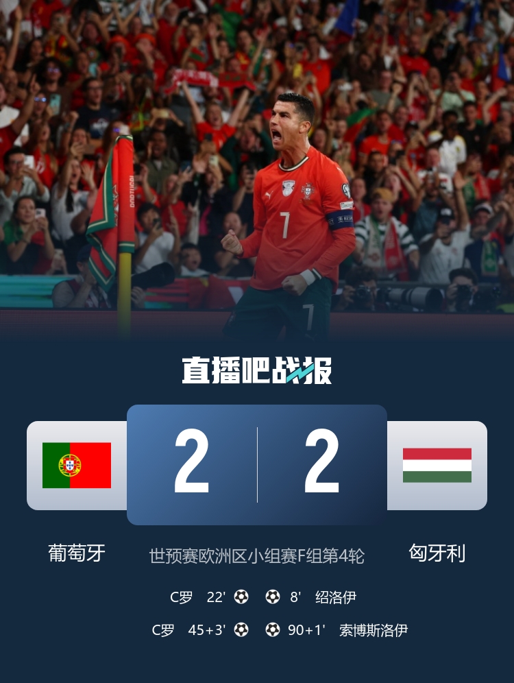 世初赛欧洲区小组赛F组第4轮,葡萄牙2-2匈牙利,无缘本轮晋级全国杯正赛,C罗梅开二度。