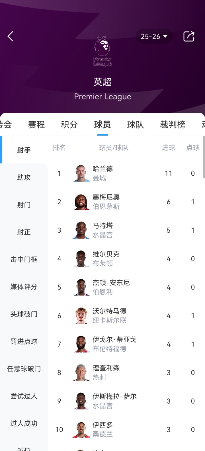 英超弓手榜:哈兰德8轮11球领跑!塞梅尼奥6球第二马特塔5球第三