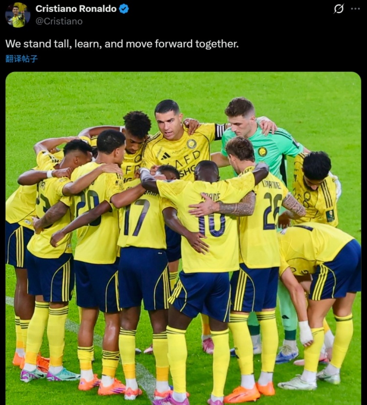 C罗在赛后通过社媒晒出全队围成一圈时我方的喊话照,并配文:“咱们抬头挺胸,一说念学习何况连续上前。”