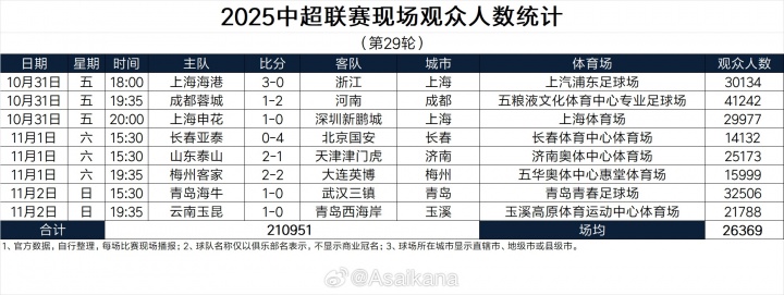 2025中超联赛现场不雅世东谈主数统计(第29轮)